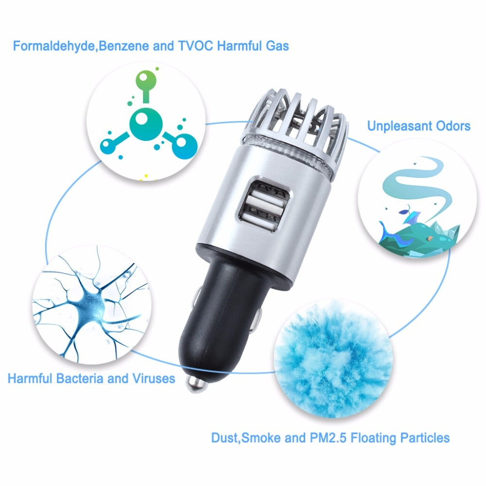 The use of multi-point pulse tip technology significantly increases the oxygen anion release and air purification efficiency.By releasing 5.6 million pcs/cm^3 of oxygen anions and minute quantities of ozone (≤0.05ppm), it can effectively eliminate a variety of air pollutants.DUAL 2.1A USB CHARGER: