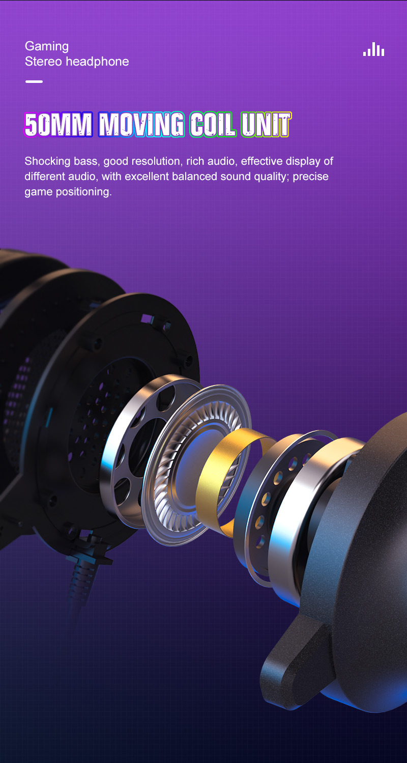 The 50MM voice coil unit shocks the bass, has good resolution, can present rich sounds, effectively show different sounds, and the sound quality is excellent; the game positioning is accurate.
