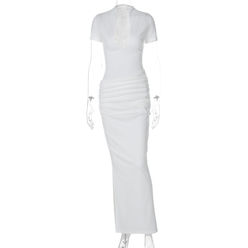 Deep V Short Sleeve Solid Color Hot Girl Style Pleated Long Dress