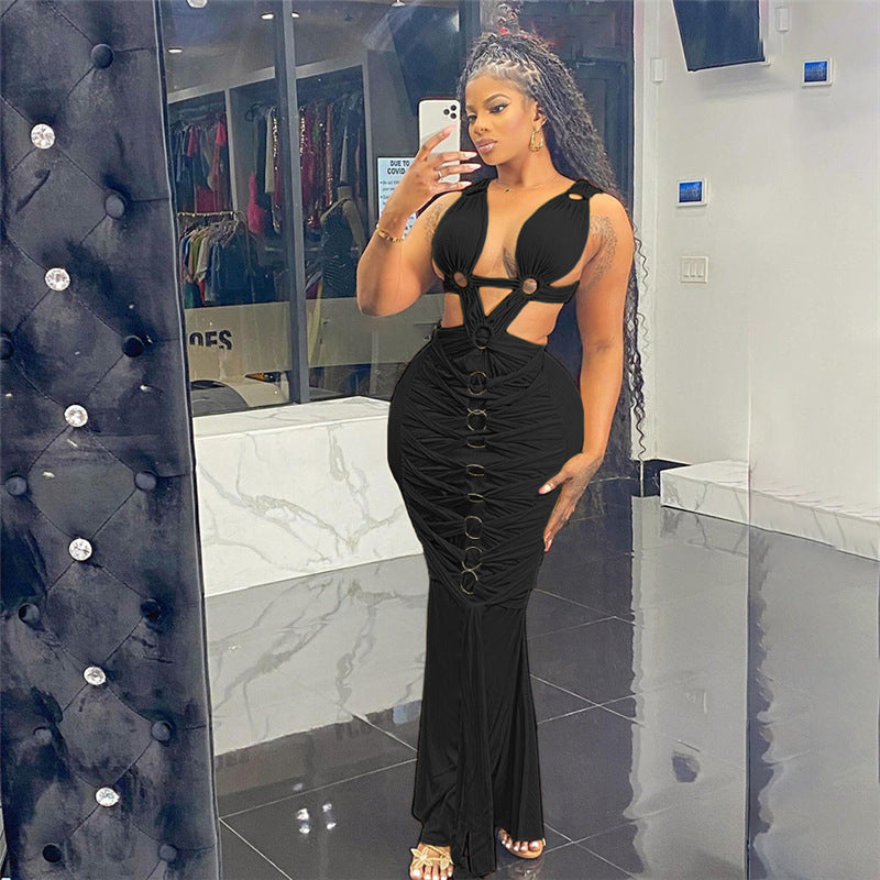 European And American Sexy Hot Girl Hollow-out Ripped Lace-up High Waist Figure Flattering Sheath Dress