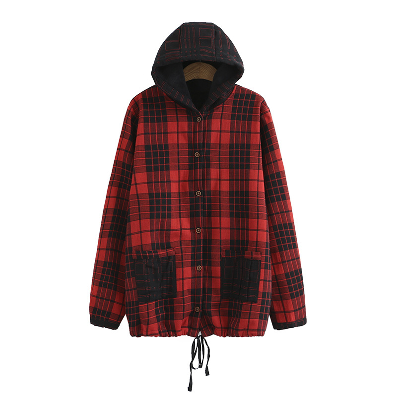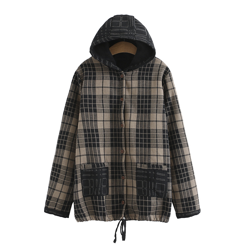 H5 plus size women's autumn and winter new fat sister mm plus velvet plaid double yarn hooded lining