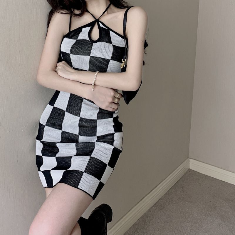 Hot Girl Suspender Dress Three-color Plaid Water Drop Collar Skirt Women