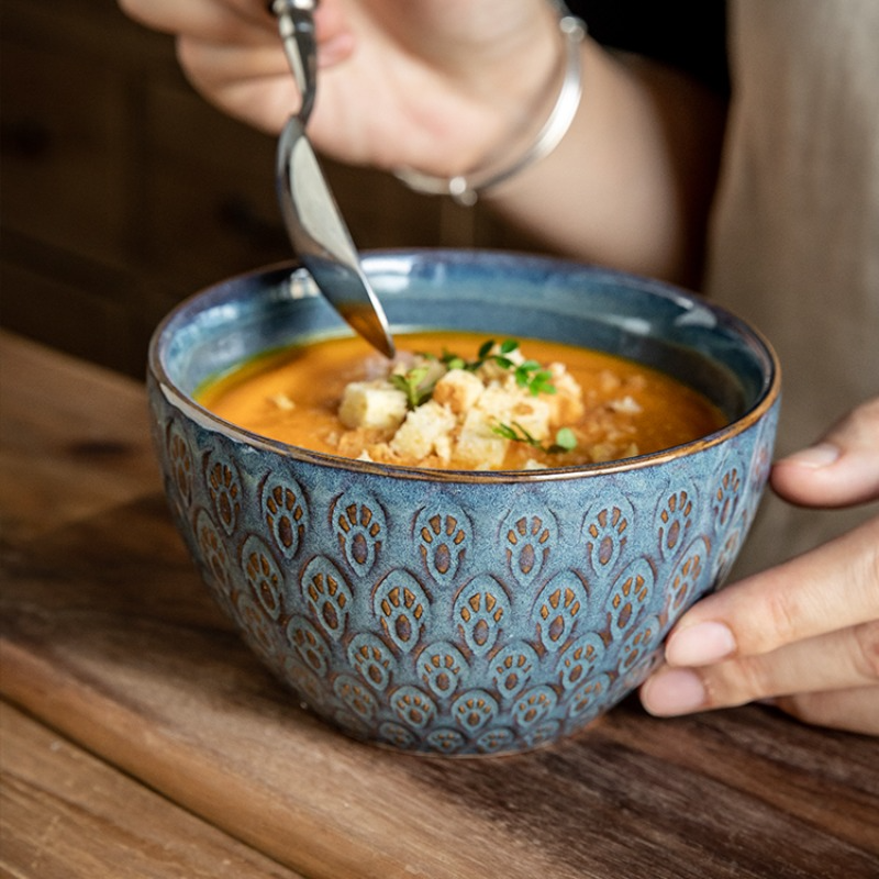 Household 5-inch Ceramic Peacock Relief Rice Bowl