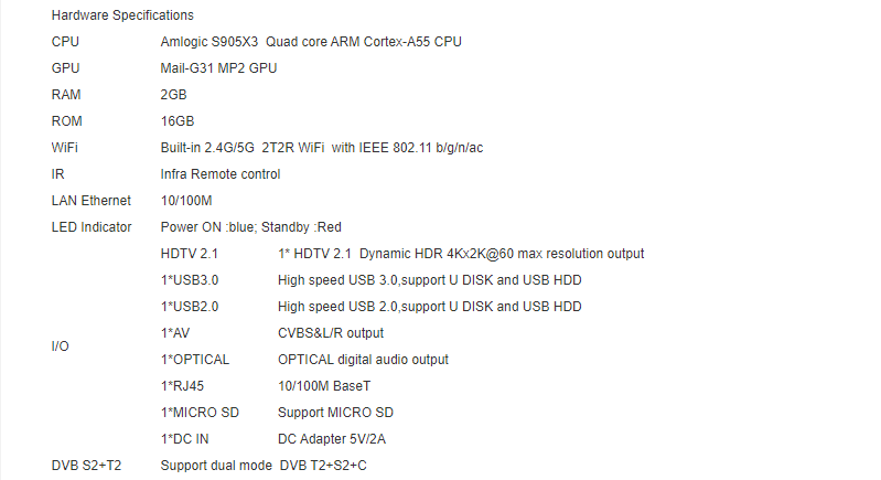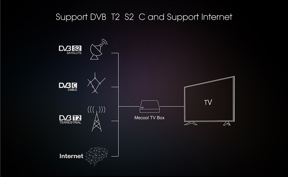 - TV Receiver: DVB-S2, DVB-T2, DVB-C