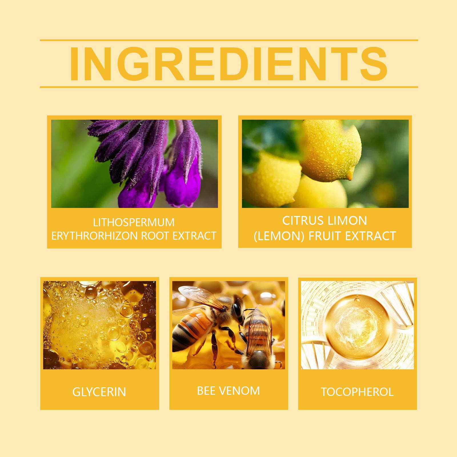 Ingredients: glycerin, bee venom, radix arnebiae seu lithospermi extract, lemon extract, vitamin E (tocopherol)