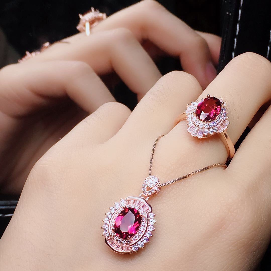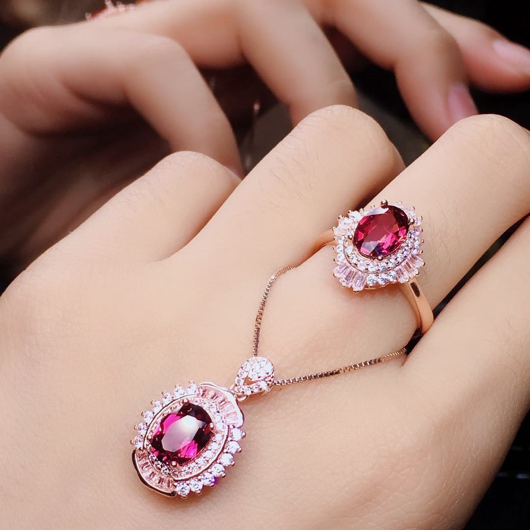 The new magnesia-aluminum garnet set, the crystal is clean and translucent, the color is beautiful, the fire color is full, the main stone size: 6×8mm, 925 silver rose gold