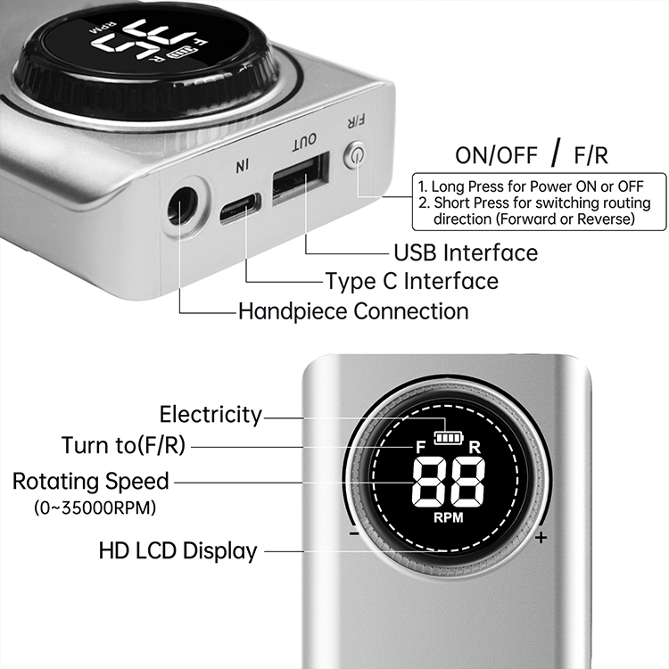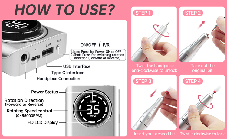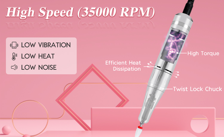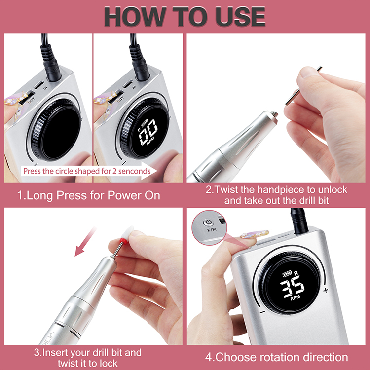 It can be switched forward and backward, right-handed or left-handed. Variable speed control, suitable for different use requirements. Improved wireless smooth operation handle through flexible expansion. The rotary lock block is used to fix the drill bit and quickly release the drill bit. Make your nail art more effective and save a lot of time.