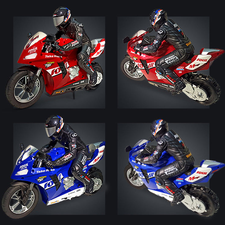 Product functions: forward, backward, left turn, right turn, indoor mode, outdoor mode, terrain switching, U-turn in place, self-stabilization balance, 360-degree drift, acrobatic single-wheel standing and other functions. The traction control of the rear rubber balance wheel can be self-stabilized and balanced, subverting the traditional remote control motorcycle toy. Using traction smart wheels, it can achieve in-situ 360° drift through 16 rubber side wheels, and the single wheel stands sideways to move, which is full of sense of science and technology. Detachable design for motorcycle riders.