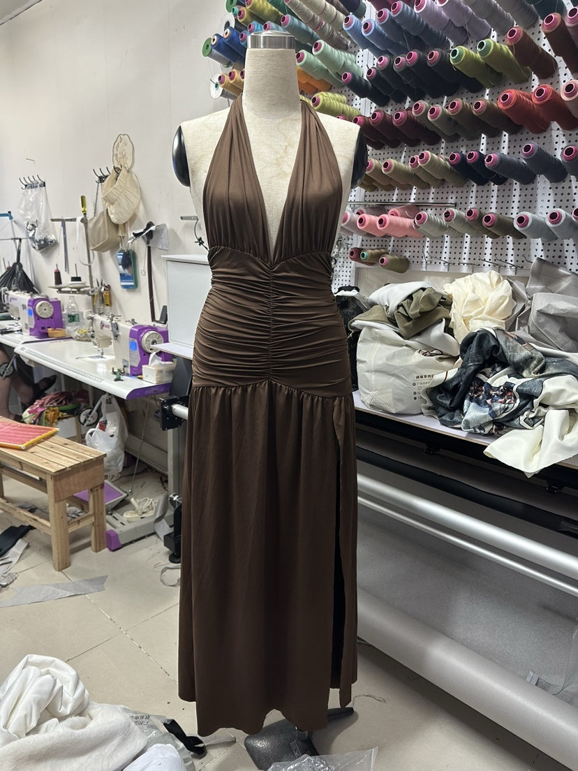 Socialite Style Hot Girl V-neck Halter Sexy Slit Pleated Dress