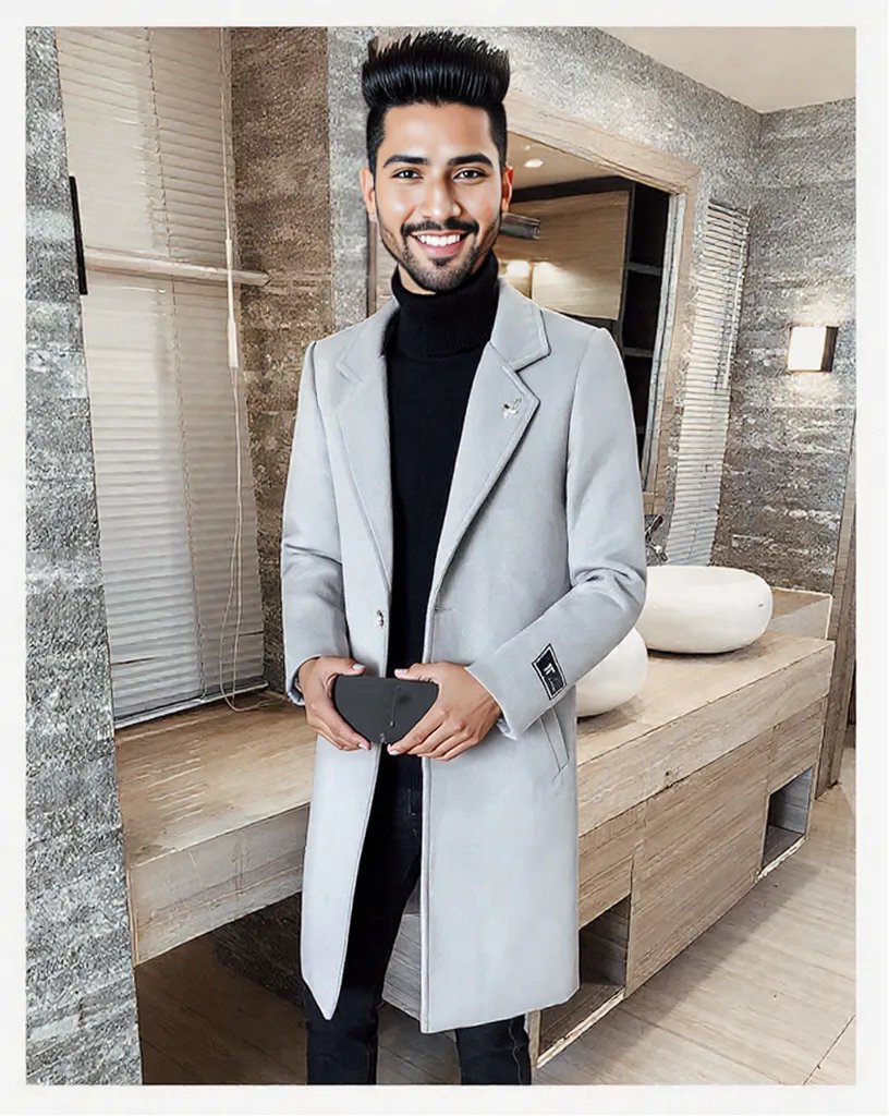 Stay stylish and warm this Winter with our fashionable black long overcoat for men. Made with high-quality materials, this overcoat is designed to keep you comfortable and protected from the elements. Perfect for any occasion, upgrade your wardrobe with this essential piece.